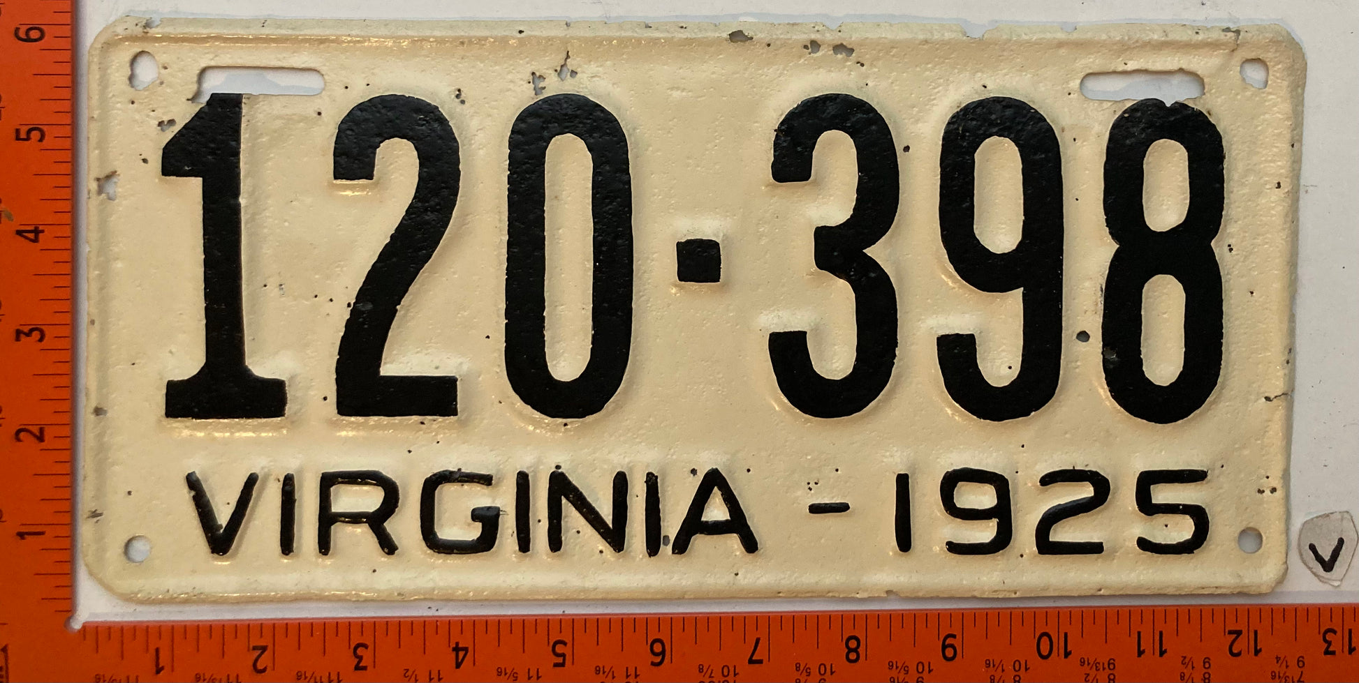 1925 Virginia #120-398 Passenger License Plate (Repaint)