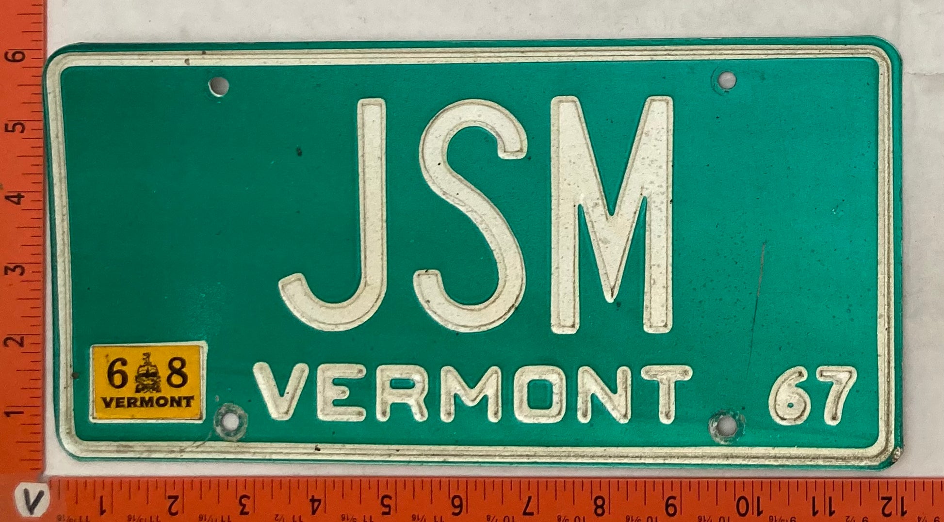 1968 Vermont #JSM Passenger License Plate (Vanity)