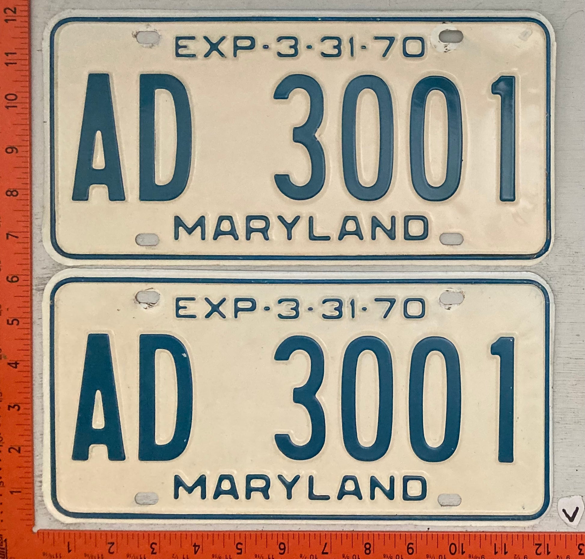 1970 Maryland #AD 3001 Passenger License Plate (Pair)