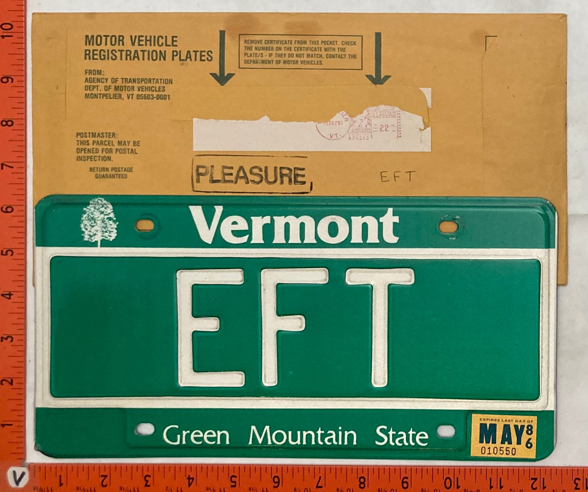 1986 Vermont #EFT Passenger License Plate (Vanity)