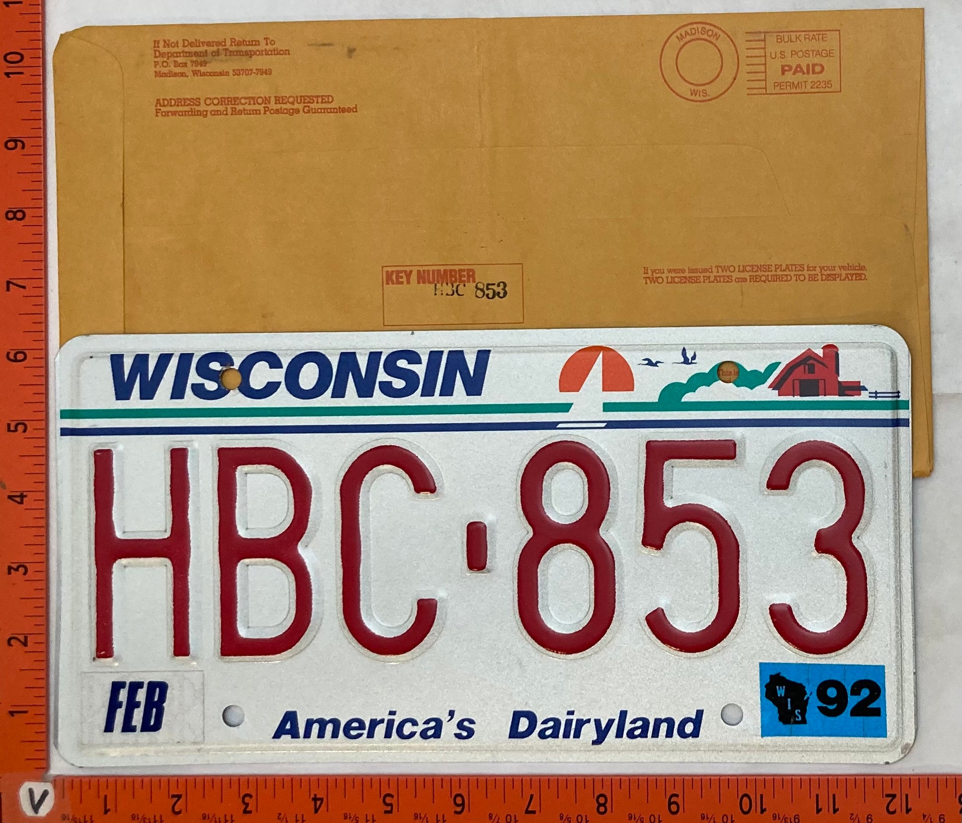 1992 Wisconsin #HBC-853 Passenger License Plate (with Envelope)