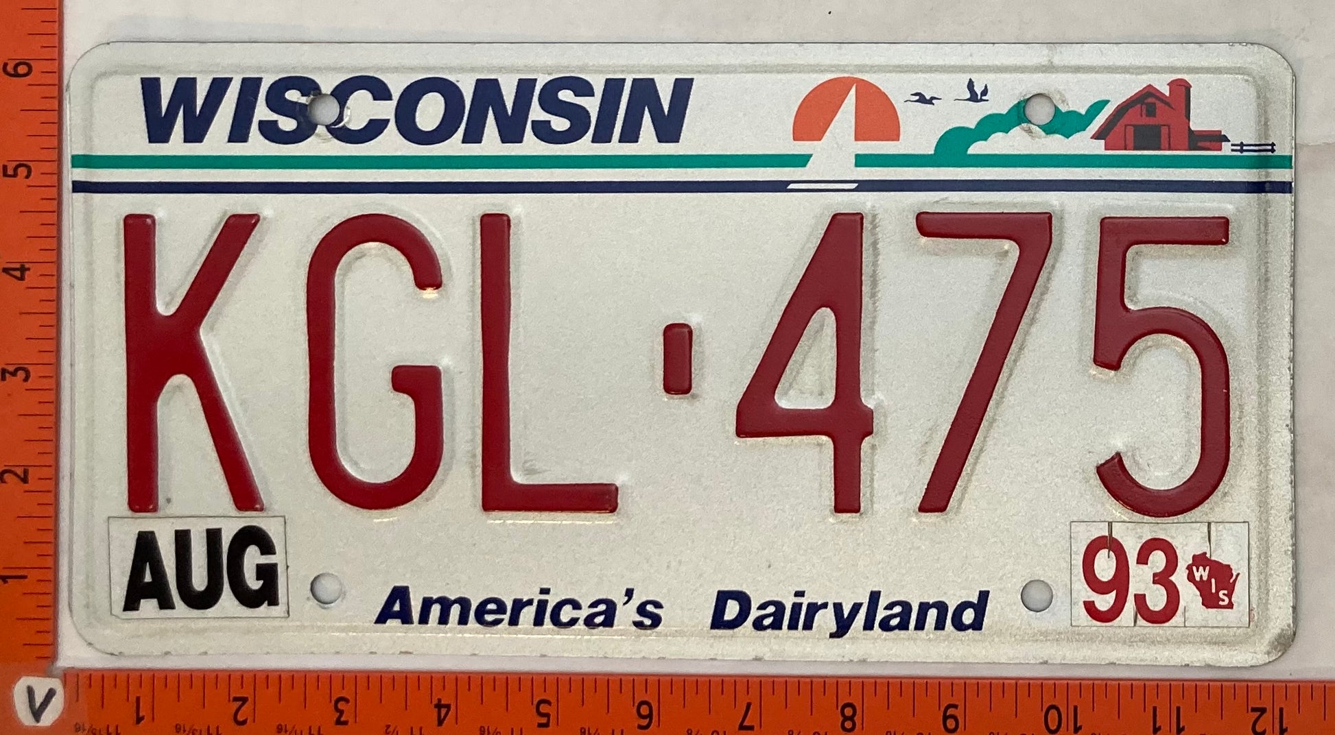1993 Wisconsin #KGL-475 Passenger License Plate